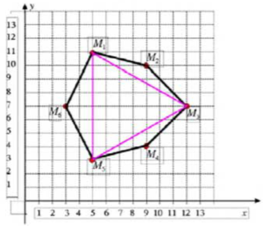 Bờm vừa thắng Phú ông trong một lần thách đố. Phú ông nghĩ ra một cách trả tiền thua cuộc và nói với Bờm: “Ta cho phép nhà ngươi được lựa chọn để thu hoạch lúa từ các thửa ruộng trong cánh đồng của ta, bao nhiêu tùy thích, nhưng không được thu hoạch lúa ở hai thửa có chung bờ". Biết rằng: trên bản đồ, cánh đồng của Phú ông có dạng một đa giác lồi n đỉnh ℜ =M_1M_2…M_n được chia ra làm n-2 thửa ruộng có dạng hình tam giác với 3 đỉnh là ba đỉnh của đa giác lồi . Hai thửa ruộng được gọi là có chung bờ nếu hai tam giác tương ứng có chung cạnh. Hình vẽ minh hoạ cho thấy cánh đồng của Phú ông là một đa giác 6 đỉnh được chia ra làm 4 thửa ruộng (tam giác). Ngoài ra Bờm cũng biết rằng năng suất lúa ở các thửa ruộng trên cánh đồng là như nhau. Vì vậy muốn thu hoạch được nhiều lúa nhất, Bờm cần tìm cách chọn các thứa ruộng trong cánh đồng với tổng diện tích là lớn nhất.