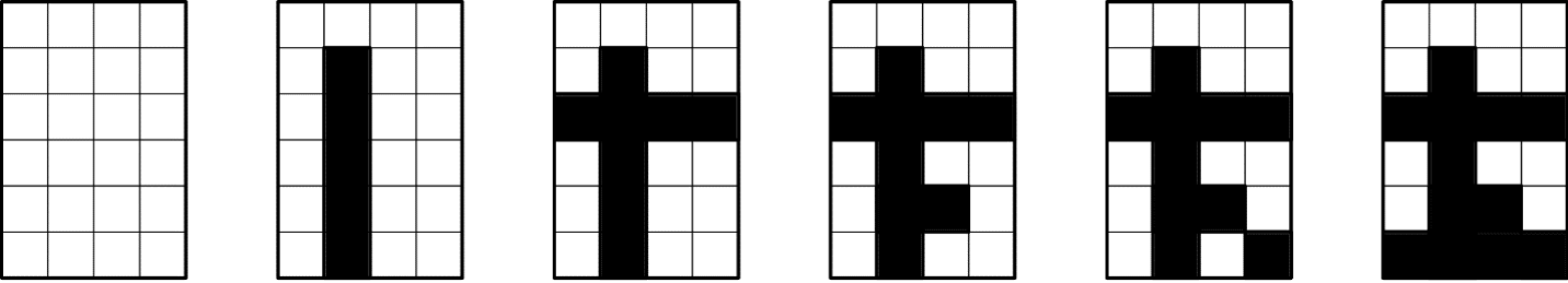 Mỗi vệt có kích thước ngang đúng bằng kích thước ô vuông, và sẽ làm đen các ô thỏa mãn . Tèo không hiểu gì về nghệ thuật, nhưng Tèo lại hứng thú với các vùng mới được tạo ra. Tèo nhìn theo các dòng vẽ của Tí rồi đặc biệt quan tâm đếm xem có bao nhiêu vùng liên thông toàn màu trắng.