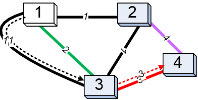 Yêu cầu: Cho và các đường đi xác định đường màu nối từ phòng tới phòng . Dữ liệu đảm bảo có đường đi từ phòng đến phòng . Hãy xác định đường đi lý tưởng: số đoạn đường và màu của các đoạn đó theo trình tự đi.