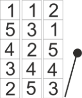 Bajtek đến sòng bạc và bị cuốn hút bởi trò máy quay số. Bộ phận quan trọng nhất của cỗ máy là trống quay tròn. Mỗi trống quay được chia thành phần bằng nhau và mỗi phần được in vào đó những biểu tượng khác nhau. Có đúng biểu tượng, mỗi biểu tượng xuất hiện đúng một lần trên mỗi trống quay. Để đơn giản, chúng ta biểu diễn các biểu tượng bằng các số từ đến . Hình sau minh họa trống quay với .