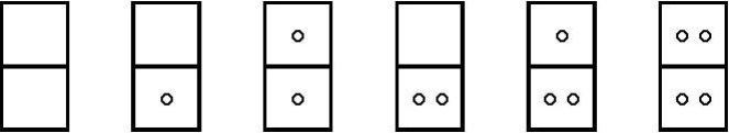 Domino là một trò chơi phổ biến. Mỗi quân domino được chia thành hai phần, phần trên và phần dưới. Trên mỗi phần có một số dấu chấm thể hiện điểm của phần đó. Vì ta có thể xoay quân domino nên luôn có thể giả thiết rằng số chấm ở phần trên luôn nhỏ hơn hoặc bằng số chấm ở phần dưới. Kích cỡ của domino là số chấm lớn nhất ở phần dưới. Ví dụ như dưới đây mô tả tập hợp tất cả các domino khác nhau có kích cỡ không vượt quá :