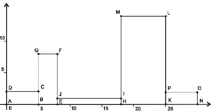 • Cách xếp mà thu được chiều dài lớn nhất là hình trên. Cạnh phía trên gồm các đoạn DC, CG, GF, FJ, JI, IM, ML, LP , và PO . Độ dài của đoạn này là 5 + 6 + 3 + 7 + 10 + 13 + 7 + 12 + 5 = 68