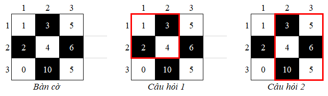 Cho một bàn cờ vua kích thước n×n , trên mỗi ô của bàn cờ có ghi một con số. Biết ô trên trái của bàn cờ vua là ô trắng (các ô của bàn cờ vua có dạng xen kẽ trắng đen). Các cột được đánh số từ 1 đến n từ trái sang phải, các hàng được đánh số từ 1 đến n từ trên xuống dưới. Ô ở hàng i , cột j của bàn cờ được ký hiệu là ô (i, j) .