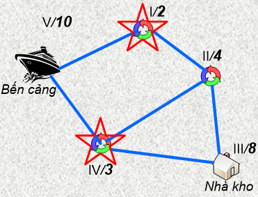 Yêu cầu: Cho là số trạm thu phí, là số đoạn đường trong mạng giao thông, trạm gần cảng nhất và trạm gần kho nhất, chi phí ở trạm , các đoạn đường được mô tả dưới dạng cặp số nguyên – các trạm thu phí ở hai đầu. Hãy chỉ ra các trạm cần bố trí chốt chặn. Giả thiết luôn tồn tại đường đi từ tới .
