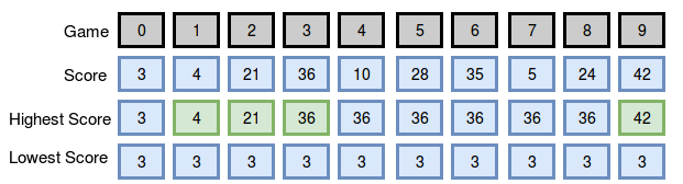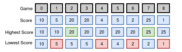 HD chơi game bóng rổ, sau mỗi lần chơi, số điểm HD được ghi lại thành một dãy số . Sau game thứ , HD sẽ kiểm tra xem anh ấy có phá vỡ kỷ lục điểm cao nhất hoặc chìm sâu hơn kỷ lục điểm thấp nhất.