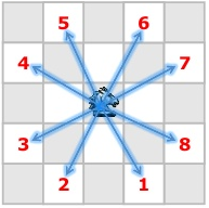 Trên một mảnh đất hình chữ nhật được chia thành dòng, cột. Chú ngữa xích thố đứng ở một ô nào đó. Mỗi bước di chuyển chú ngựa này được phép bước sang một ô khác là ô đối diện trong một hình chữ nhật hoặc (như hình dưới đây)