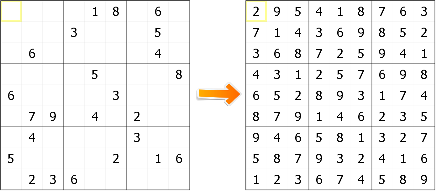 Trong chúng ta chắc hẳn ai cũng đã từng chơi trò giải ô chữ SUDOKU. Đó là trò chơi điền các số từ đến vào bảng hình vuông sao cho trên mỗi hàng ngang, mỗi cột dọc và mỗi hình vuông đều có đủ các số từ đến , mỗi số chỉ có mặt lần. (Xem hình vẽ)