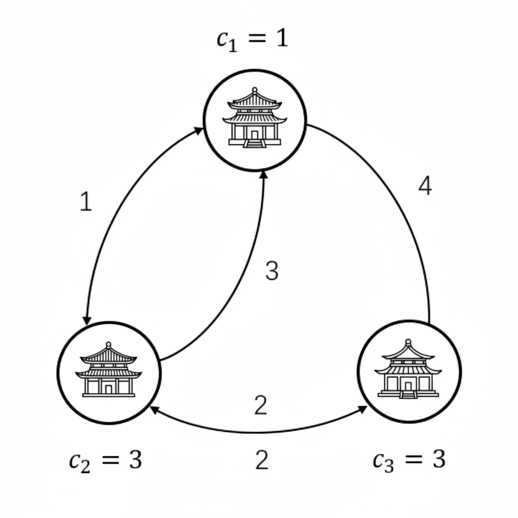 Với mọi , có . Có thể có nhiều con đường một chiều nối cùng một cặp đền.